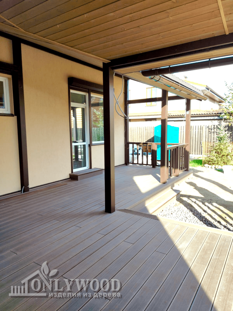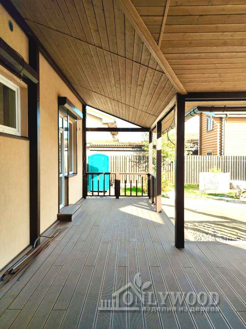 Веранда во Всеволожске: терраса из ДПК, крыша из композитной черепицы, ограждение «Версаль» и подшивка потолка из скошенного планкена.